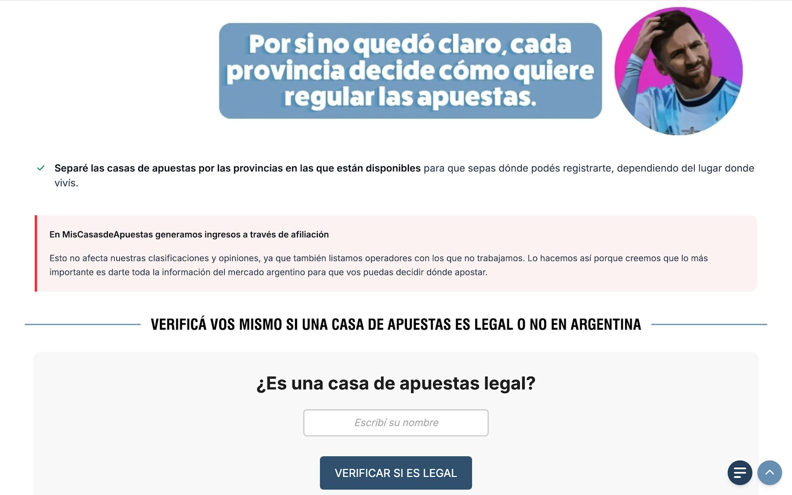 - Mencionan la regulación local al pasar, sin explicar nada más. Sin embargo, tampoco se enfocan en todo el país; solo te dan información de las casas de apuestas de PBA y CABA.