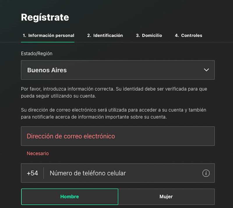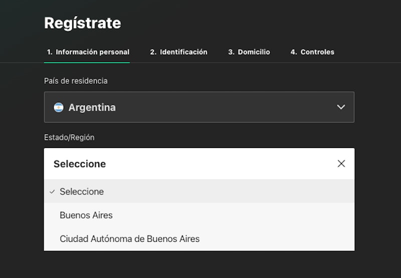 Lo primero que vas a ver en el formulario de registro de cualquier casa de apuestas argentina son las provincias en las que está disponible. Acá, tenés que elegir la tuya (si elegís una que no coincide con tu DNI no vas a poder apostar después de la verificación).